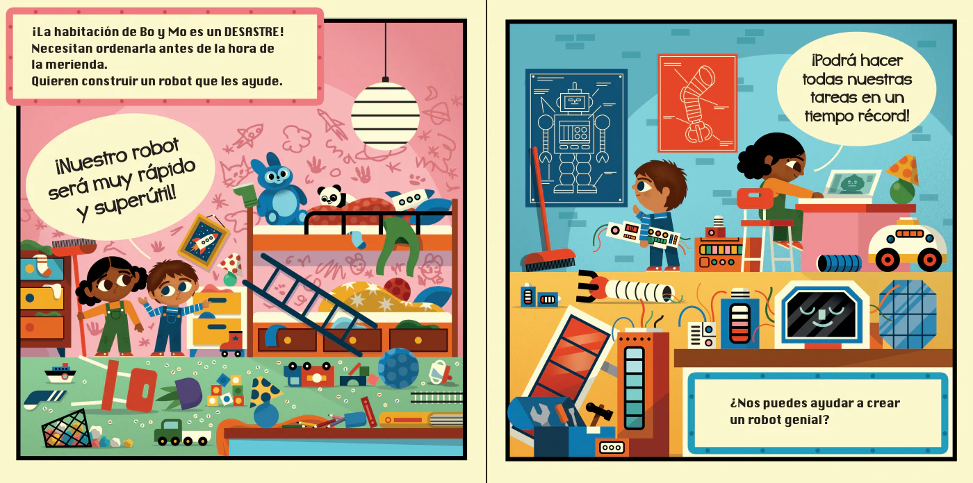 Bo y Mo necesitan ordenar su habitación… ¡Y ellos van a construir un robot que les ayude! Pasa las páginas para construir tu propio robot. ¿Jugará al fútbol, fregará los platos o te preparará la cena? Hay más de 180 combinaciones diferentes para elegir.
